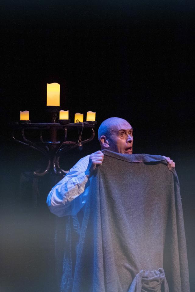 And all the time, he adds to the atmosphere of the piece by introducing his own sound effects, the bubbling of gruel in the pot, the kerchink-clank of a chain dragging up a stair, the muffled whoosh of a ghost appearing through a locked door, and the whistle of the wind - which wasn't strictly necessary on an open air stage in December!