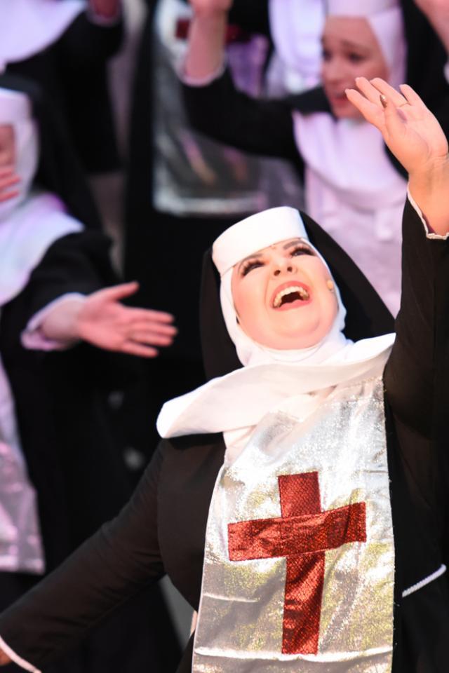 In the meantime, the cash-strapped convent is threatened with closure, to the despair of Monsignor O’Hara, Andy Yeates, but guess-what, an emphatically out-of-tune choir of 30 nuns, is taken in hand by Deloris, and the dollars flood in.