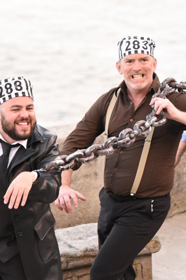 Seven actors, including production manager Judith Lewis, shared many roles, even turning their hands to becoming a chain-gang at work “smashing up rocks on a cliff in Cornwall, making a theatre that no-one will ever visit”!