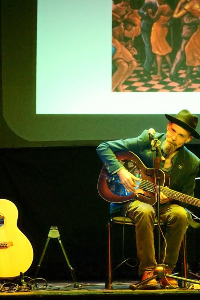 We got the drift when he introduced the first of many, the "uplifting" lyrics of Panic Attack, and telling us that he specialises in subjects that people may never write songs about, including Crematorium Blues, On The Chicken Sandwich Train, Black Dog Moan and Doing Time.