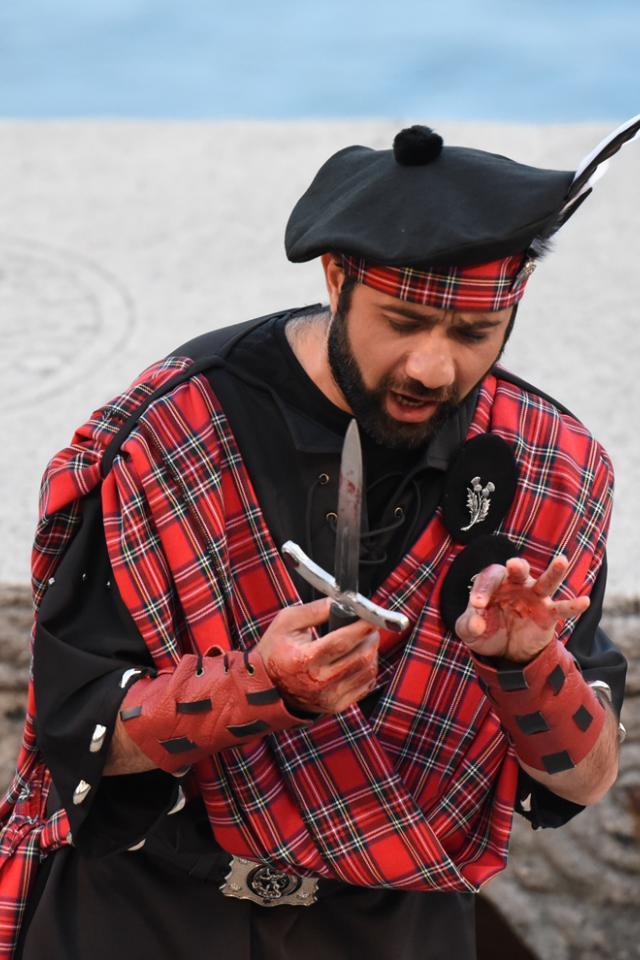 The stage is bleakly bare, the king’s pennant flutters despondently, the only spectacle comes from the voices of the principal singers, and a retinue of turbaned courtiers, soldiers in feathered tam-o-shanters, tartan townsfolk, cut-throats and refugees, whose fine individual voices harmonised with energy.