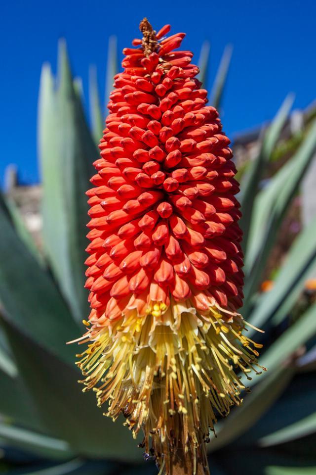 The position of the Minack creates a unique mix of geological and climatic conditions, which enable exotic plants to thrive. High light levels created by our south-east aspect overlooking the sea aids the growth of tender plants. By creating smaller microclimates within the garden, we are able to grow plants from around the world. Many originate in South Africa, South America and the Canary Islands, including such delicate beauties as Aeonium, Aloe, Crassula, Echium and Protea not to mention the magnificent Cape Silver Tree (Leucadendron argenteum). Add the breath-taking vista of the ocean beyond and our gardens are a perfect harmony of nature and art.